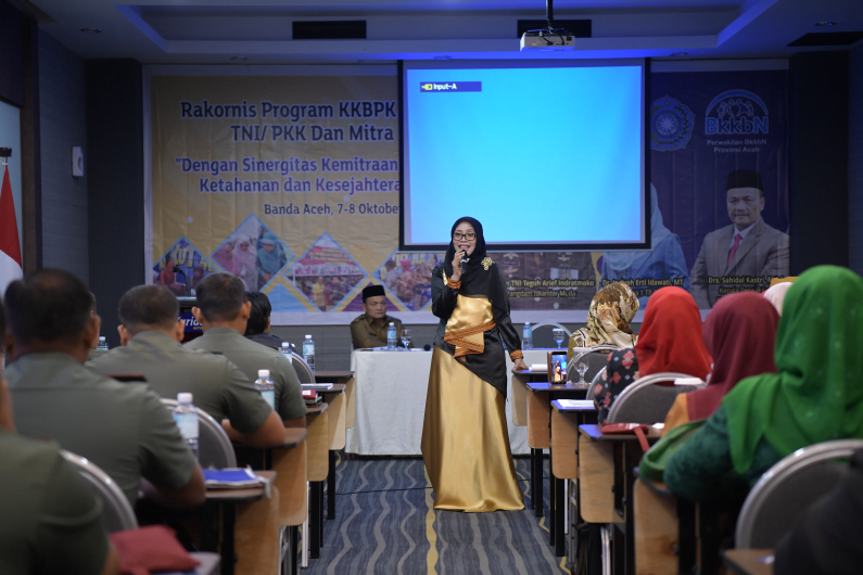 Istri Plt Gubernur Aceh, Dyah Erti Idawati menyampaikan materi pada Rapat Kordinasi Teknis (Rakornis) Program Kependudukan, Keluarga Berencana, dan Pembangunan Keluarga (KBPK) yang digelar BKKBN Aceh di Kyriad Muraya Hotel, Banda Aceh, Selasa (8/10/2019).