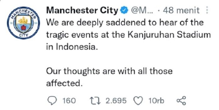 “Kami sangat sedih mendengar peristiwa tragis di Stadion Kanjuruhan di Indonesia,” tulis Manchester City melalui akun twitter resminya.