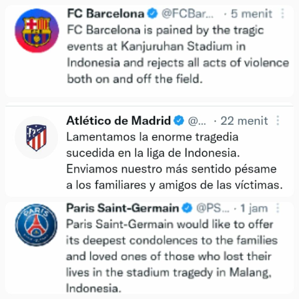 Analisaaceh.com | Sejumlah klub raksasa Eropa menyampaikan duka dan ikut prihatin atas tragedi Kanjuruhan Malang yang menelan korban jiwa hingga ratusan orang.
