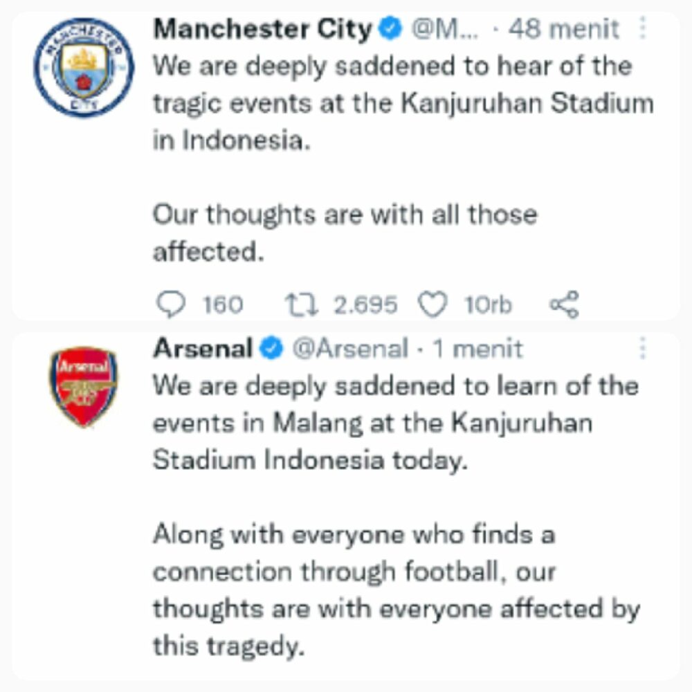 Dilihat dari Twitter pada Minggu (2/10), sejumlah klub dari Premier League seperti Manchester City, Manchester United, Arsenal, Liverpool turut menyampaikan keprihatinan atas peristiwa itu.