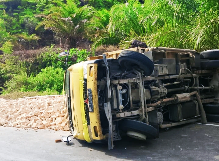 NEWS Truk Bermuatan Batu Bata Terguling di Gunung Kapur