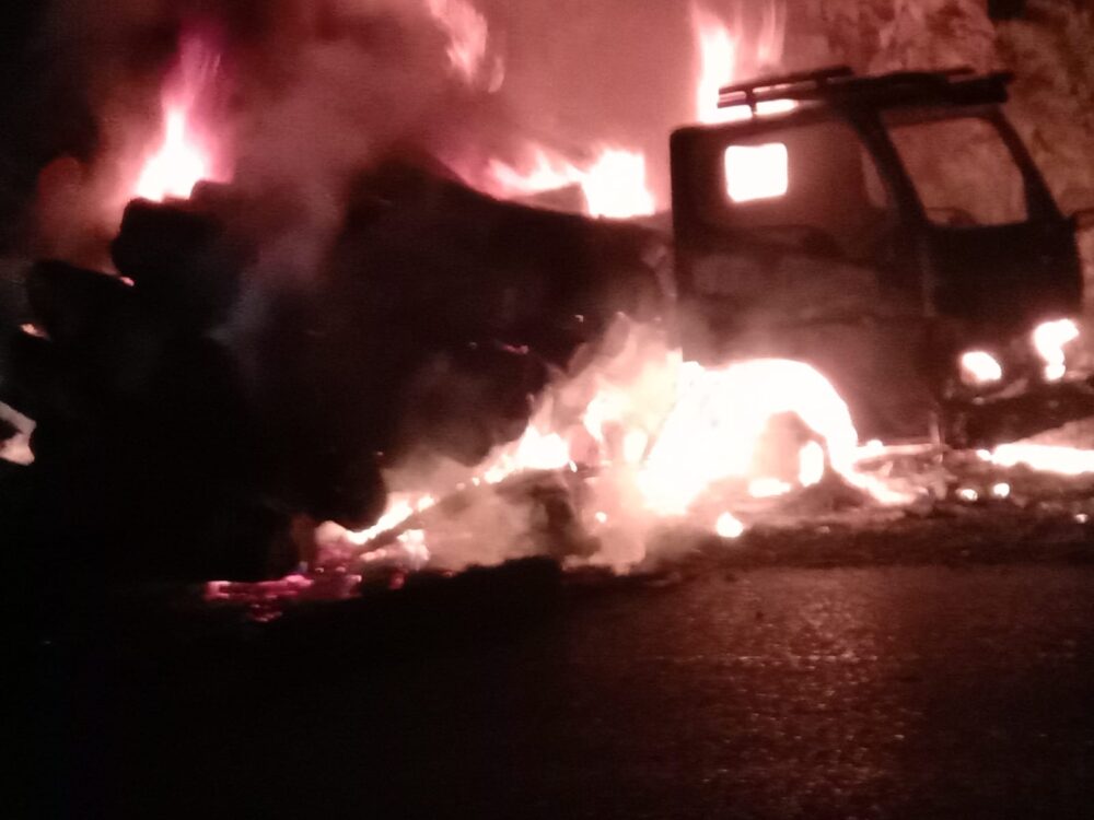 Mengetahui kejadian tersebut, sopir truk kemudian berusaha memadamkan api dibantu warga sekitar, namun api tidak berhasil dipadamkan sehingga membakar seluruh truk.