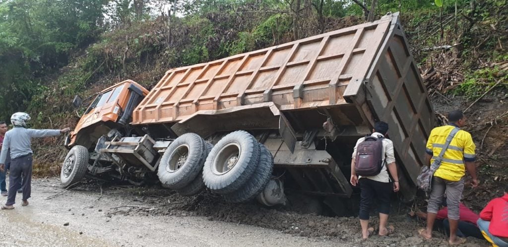 Analisaaceh.com, Lhoksukon | Sebuah mobil pengangkut material untuk proyek Waduk Krueng Keureto jenis Mitsubishi Dum Truck Tronton bernopol BM 8283 SU mengalami laka lantas di jalan Gampong Blang Pante Kecamatan Paya Bakong Kabupaten Aceh Utara pada senin (30/9/2019) kemarin.