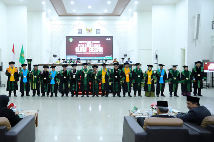 Analisaaceh.com, Banda Aceh | Universitas Islam Negeri (UIN) Ar-Raniry Banda Aceh kembali menambah jajaran akademiknya dengan mengukuhkan 17 guru besar dari berbagai bidang keilmuan dalam Rapat Senat Terbuka yang berlangsung di Auditorium Prof Ali Hasjmy, Kamis (7/8/2025).