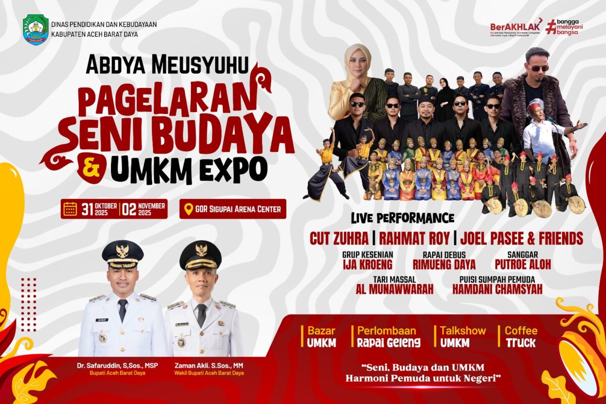 “Saya mengajak semua warga Abdya mari kita ramaikan acara pagelaran seni, budaya dan umkm expo ini,” kata Safaruddin, Senin (27/10/2025).