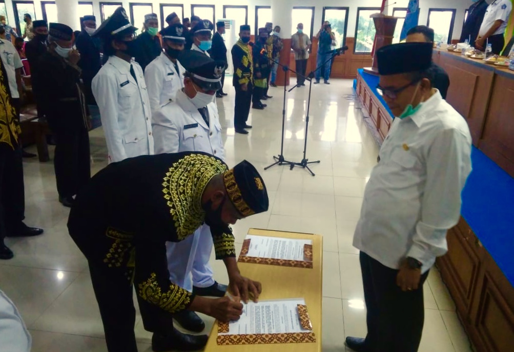 Salah Satu Imum Mukim Mendatangani Berita Acara Sumpah Jabatan di Depan Wakil Bupati Pijay Said Mulyadi. SE., M.Si di Aula Cot Trieng, Meureudu, Rabu, (13/1/2021) (Foto: Analisaaceh.com/Teuku Satria)