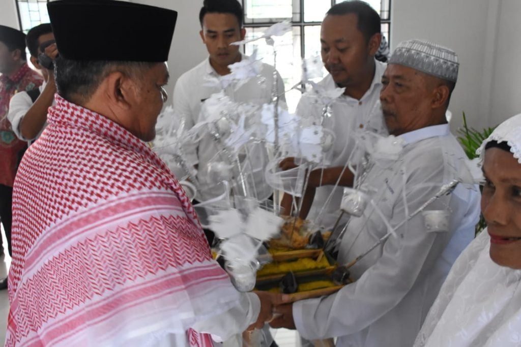 Acara Tersebut diawali dengan pembacaan Ayat Suci Alqur’an dan dikumandangkan Talbiayah, sekaligus Wabup menepung tawari seluruh calhaj dan menyerahkan bingkisan dan Tali Asih kepada seluruh peserta Manasik yang berlangsung sejak Senin (24/6).