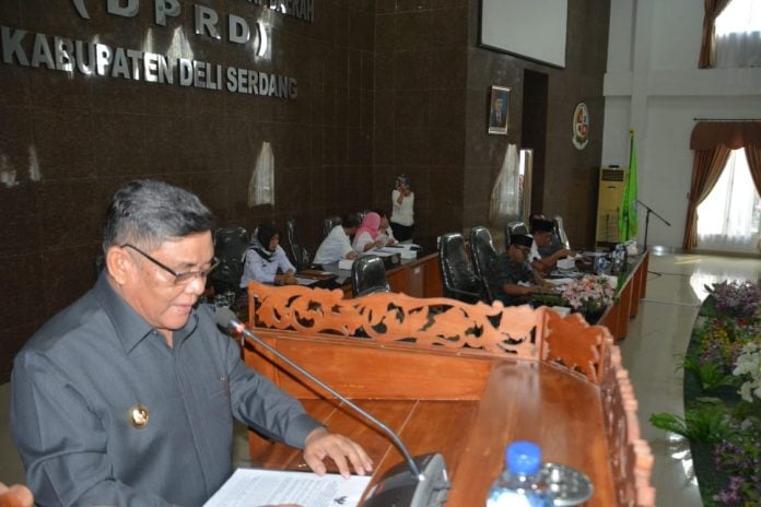 Sumut – Wakil Bupati Deli Serdang HMA Yusuf Siregar menyampaikan Nota Keuangan Rancangan Peraturan Daerah (Ranperda) tentang Perubahan Anggaran Pendapatan dan Belanja Daerah (P-APBD) Kabupaten Deli Serdang Tahun Anggaran 2019, pada Sidang Paripurna DPRD Deli Serdang dipimpin Wakil Ketua DPRD Deli Serdang Kamaruzzaman S.Ag didampingi Timur Sitepu dan Imran Obos tuut dihadiri unsur Forkopimda, para Asisten dan Pimpinan OPD, Rabu (26/6)Siang di ruang sidang DPRD Deli Serdang Lubuk Pakam.