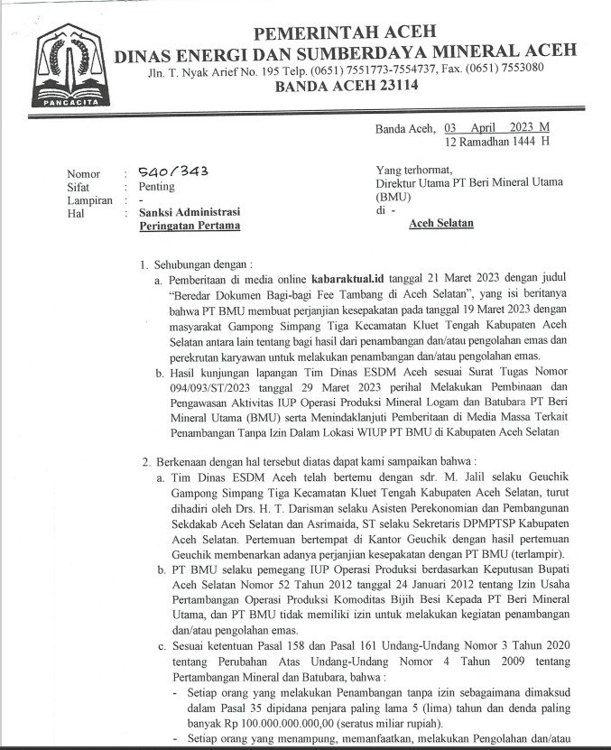 Sebelumnya, Dinas Energi Sumber Daya Manusia (ESDM) Aceh mengeluarkan surat sanksi administrasi peringatan pertama terhadap kegiatan penambangan dan pengolahan emas di dalam WIUP PT. Beli BMU yang tidak sesuai dengan dokumen perizinan dan membahayakan masyarakat serta lingkungan di Kabupaten Aceh Selatan.