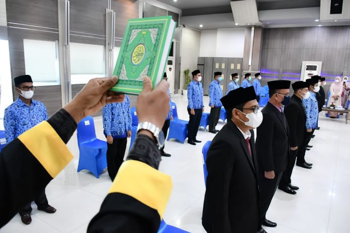 Analisaaceh.com, Banda Aceh | Wali Kota Banda Aceh, Aminullah Usman melantik 6 (enam) orang Pejabat Struktural Jabatan Pimpinan Tinggi Pratama (JPTP/Eselon II.b) dan 12 Pejabat Administrasi (Eselon III.a dan III.b) jajaran Pemko Banda Aceh, Kamis (5/8/2021) di Aula Lantai IV Gedung Mawardy Nurdin, Balai Kota Banda Aceh.