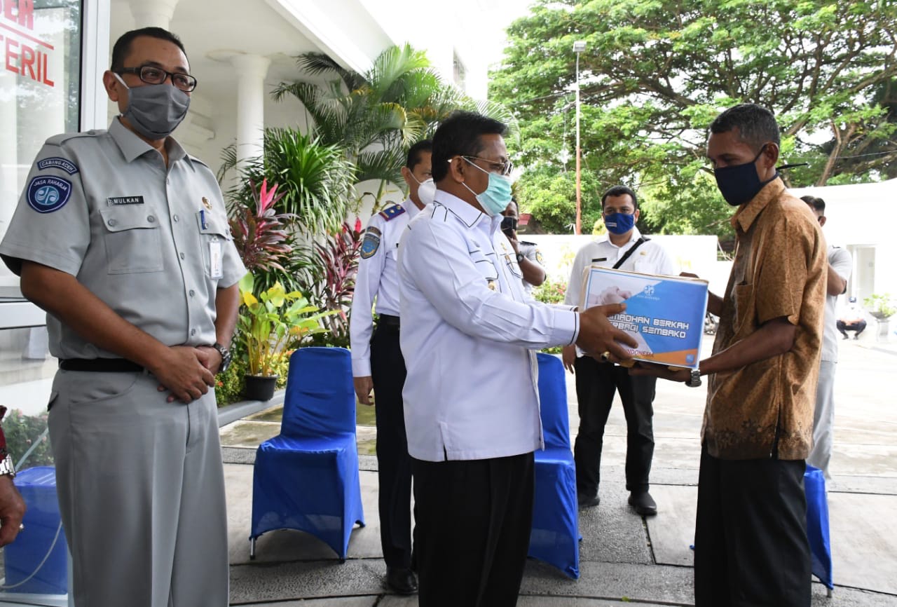 Analisaaceh.com, Banda Aceh | Wali Kota Banda Aceh Aminullah Usman menyerahkan 137 paket sembako kepada awak angkutan umum dan dua unit wastafel bantuan dari PT Jasa Raharja, Rabu (20/5/2020) di halaman Pendopo Wali Kota.