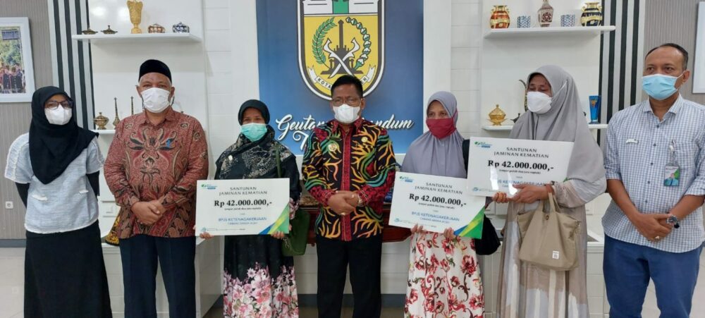Analisaaceh.com, Banda Aceh | Wali Kota Banda Aceh Aminullah Usman bersama Badan Penyelenggaraan Jaminan Sosial Ketenagakerjaan (BP JAMSOSTEK), menyerahkan santunan uang duka kepada tiga keluarga ahli waris yang merupakan pegawai Non PNS di Dinas Pemko Banda Aceh. Penyerahan santunan berlangsung di Pendopo Wali Kota, kawasan Blang Padang, Banda Aceh (Jumat, 11/2/2022).