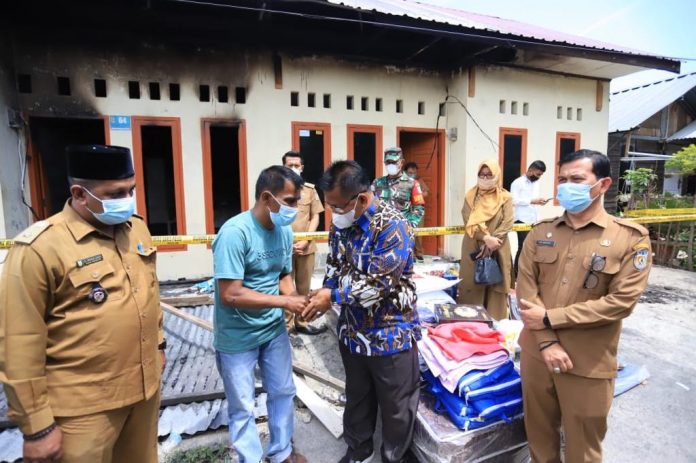 Mantan Dirut BPD itu menyerahkan bantuan masa panik untuk keluarga Antoni, yamg rumahnya mengalami kebakaran di Lampaseh Kota.