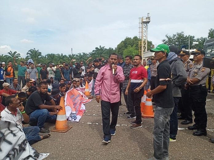 Ratusan massa yang mengusung sejumlah spanduk dan karton tuntutan mulai memadati pintu II sejak pagi Senin (4/11/2019). Massa juga melakukan orasi menuntut perusahaan agar menjamin lapangan kerja bagi warga lingkungan.