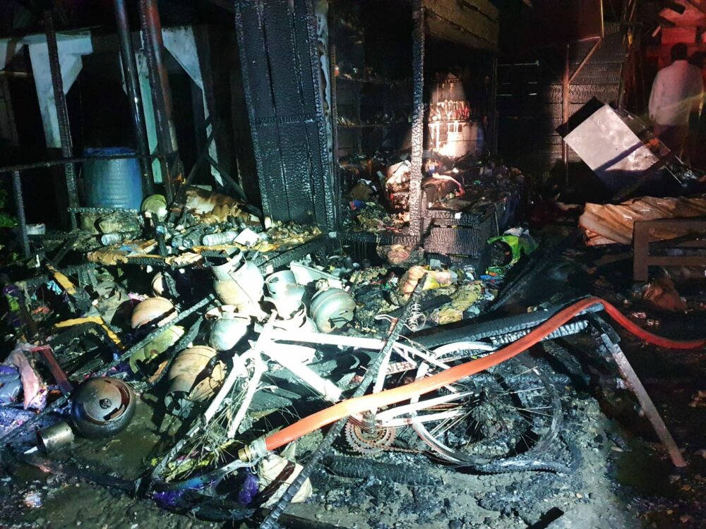 Warung kelontong dan usaha bengkel di Gampong Bate Puteh Kecamatan Langsa Lama, Kota Langsa, terbakar pada Minggu (19/6/22) malam. Foto: Ist