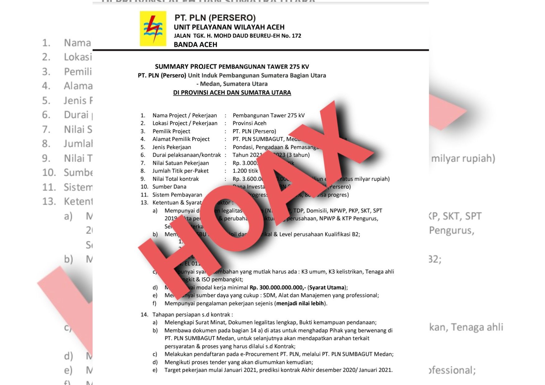 Surat yang menggunakan logo PT PLN (Persero) tersebut berjudul “SUMMARY PROJECT PEMBANGUNAN TAWER 275 KV PT. PLN (Persero) Unit Induk Pembangunan Sumatera Bagian Utara – Medan, Sumatera Utara DI PROVINSI ACEH DAN SUMATRA UTARA”, berisi tentang nama proyek, lokasi proyek, pemilik proyek serta nilai satuan yang akan ditender oleh PT PLN (Persero).