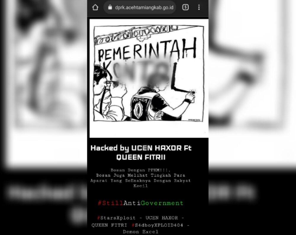 Selain itu juga terlihat latar belakang warna hitam serta tulisan “Hacked by UCEN HAXOR Ft QUEEN FITRII. Bosan Dengan PPKM!!, Bosan Juga Melihat Tingkah Para Aparat Yang SeEnaknya Dengan Rakyat Kecil” serta sejumlah tagar.