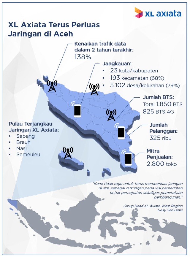 Tercatat, saat ini jaringan XL Axiata telah menjangkau 193 kecamatan atau 68% dari keseluruh kecamatan yang ada di Aceh, serta menjangkau 73% dari desa yang ada di provinsi Serambi Mekah itu.