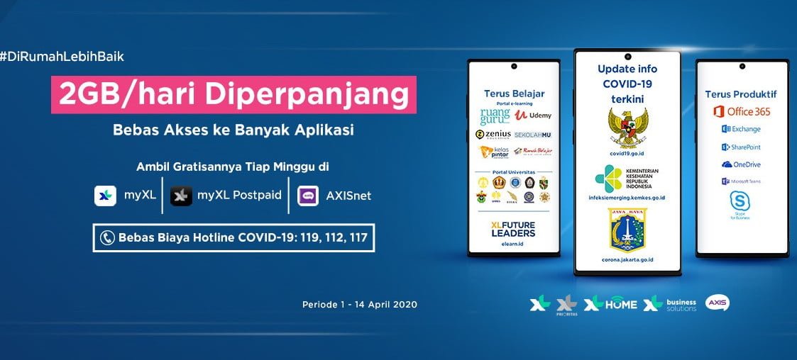 Pekan ini, XL mengumumkan bahwa pembagian kuota gratis tersebut diperpanjang, dari tadinya hingga 31 Maret menjadi 14 April mendatang, mengikuti perpanjangan masa tanggap darurat Covid-19 pemerintah.