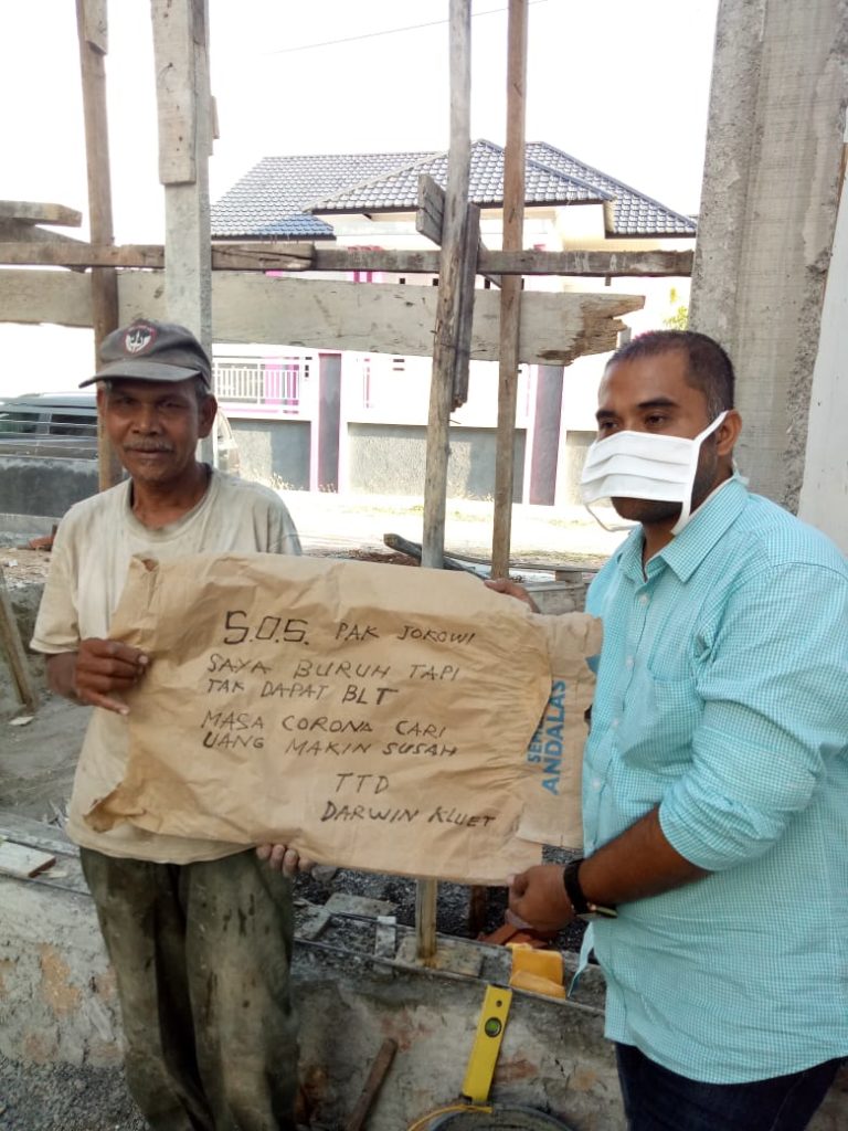 “S.O.S. Pak Jokowi. Saya buruh tapi tak dapat BLT. Masa Corona cari uang makin susah. Ttd Darwin Kluet”.