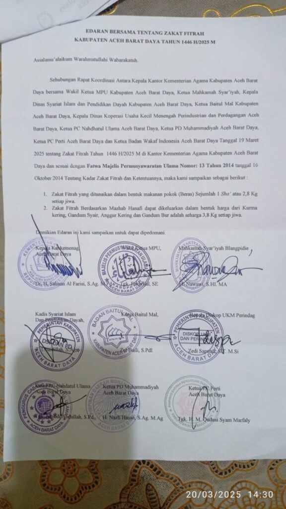 “Zakat fitrah di Abdya yang ditunaikan dalam bentuk makanan pokok (beras) sejumlah 1 sha’ atau sebesar 2,8 kilogram setiap jiwa,” tulis poin pertama Surat Edaran Bersama tentang Zakat Fitrah Kabupaten Aceh Barat Daya 1446 H/2025 M.